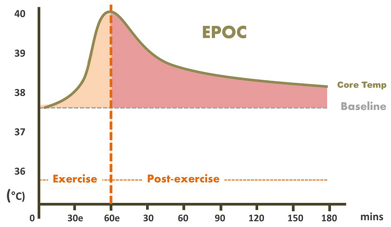 Μετά από μια έντονη προπόνηση, οι μύες και ολόκληρος ο οργανισμός συνεχίζουν να λειτουργούν σε υψηλότερους ρυθμούς για κάποια ώρα, καίγοντας περισσότερες θερμίδες ακόμα και κατά τη διάρκεια της ανάρρωσης. Αυτό το φαινόμενο μπορεί να διαρκέσει από μερικές ώρες έως και 24 ώρες, ανάλογα με την ένταση της άσκησης και τον τύπο της.